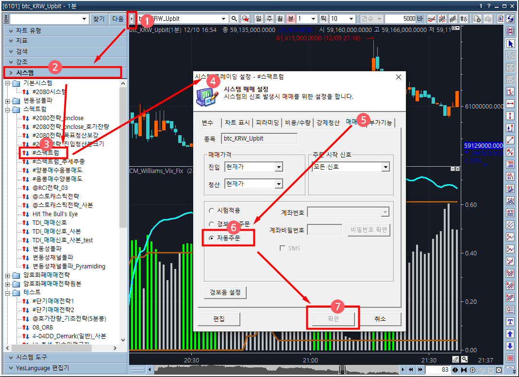 7. 확인버튼 클릭하시면 차트에 매매신호가 적용되고 신호가 확정되면 자동주문이 나가게 됩니다.