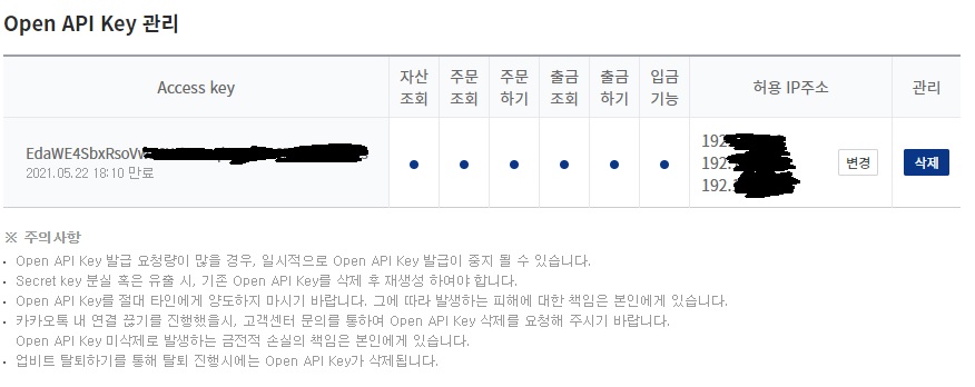 참고로 유동아이피 사용하시는 경우 아이피가 변경될 경우 API주문이 막힐 수도 있을것 같습니다.