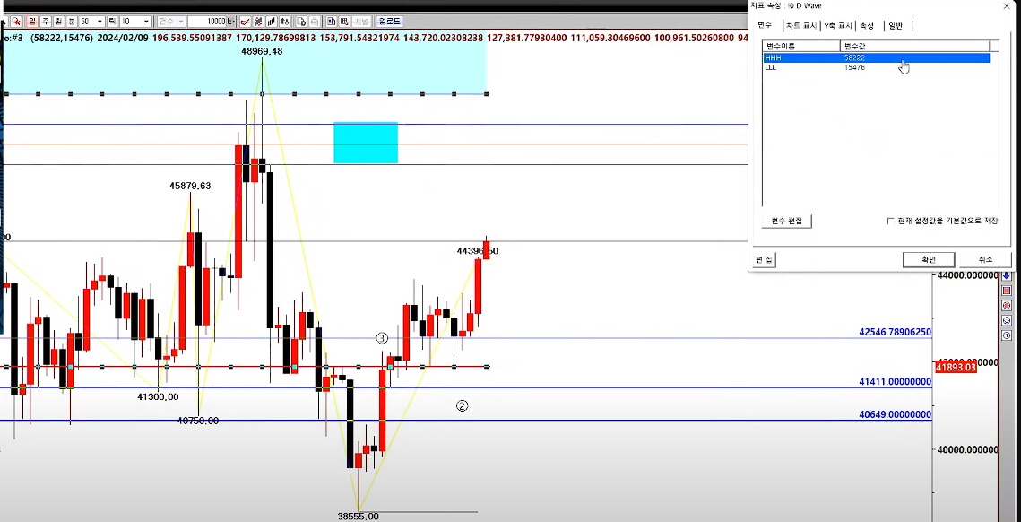 첨부파일처럼 예를들어 저점가격(LLL) 고점가격(HHH)을 변수로 입력하면 피보나치수열이 표시되는 차트를 예스트레이드 코인 예스랭귀지 편집기에 적용 할 수 있는 수식 문의드려요
