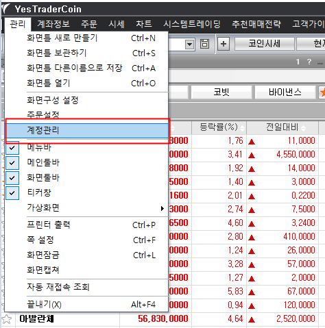 예스트레이더코인 프로그램 설치하셔서 로그인 하신 후 첨부 이미지와 같이 관리> 계정관리 화면으로 들어가서 업비트 API 등록할 수 있습니다.