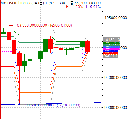 첩부화일에서 챠트의 우측에 수치를 표시하여 보고 있습니다. 시장상황에 따라 각 라인 간격의 값이 적어 그림처럼 수치가 겹쳐 보이는데, 현재는 마우스를 위치하고 휠버튼으로 시작 끝의 값을 늘려가며 보고 있습니다.